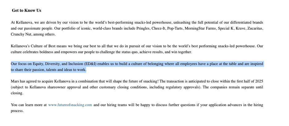 Kellanova, which owns popular brands like Pringles, Cheez-It, Pop-Tarts, and Corn Flakes has incorporated DEI into all of its employee metrics, with a stated goal of 50/50 gender parity at the management level and 25% “People of Color” in the United States and globally by the end of 2025.