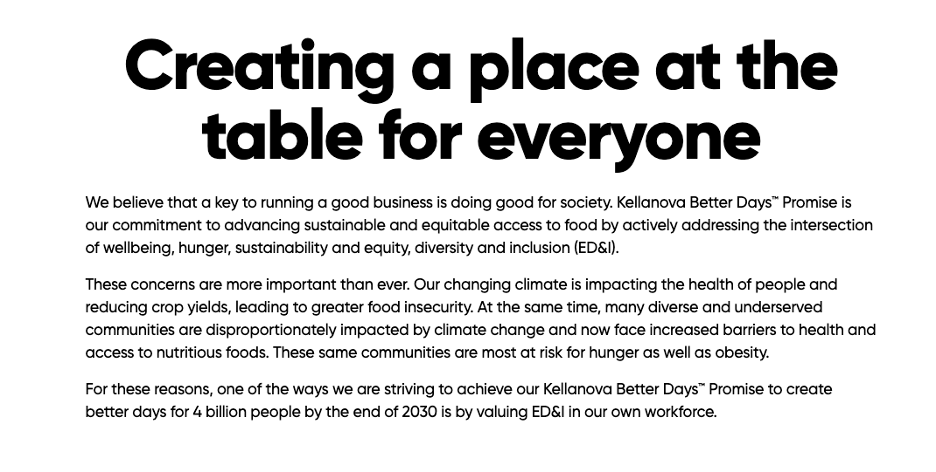 In a letter, Kris Bahner, Senior Vice President, Chief Global Corporate Affairs said that Kellanova is committing to “equity, diversity and inclusion in our own workforce.”