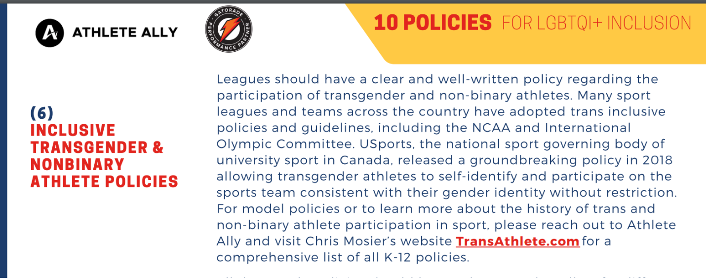 Below is a screenshot of a document published by Gatorade showing schools and leagues how to allow males to compete in women’s sports.