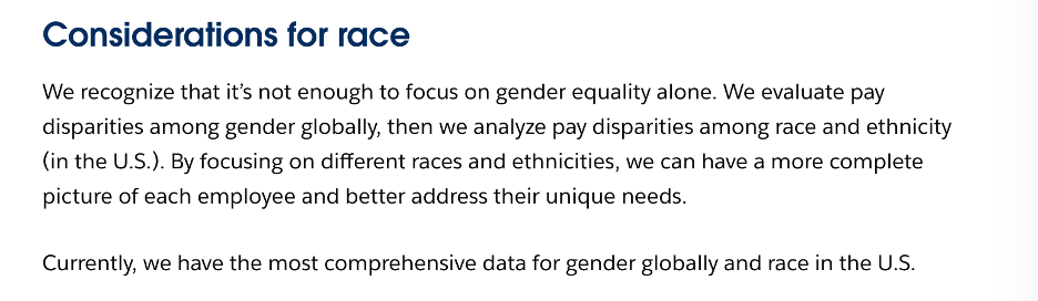 Instead of paying employees based on professional qualifications and work quality, Salesforce considers factors such as gender, race, and ethnicity when considering salaries for its employees.