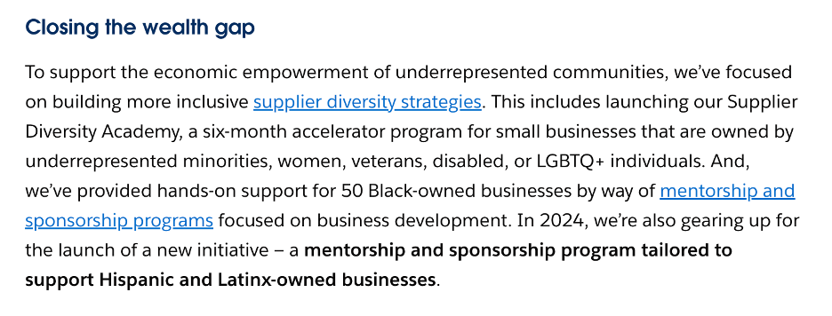 The company also promotes its supplier diversity program and hosts a “Salesforce’s Supplier Diversity Academy,” a six-month virtual accelerator program for small businesses that are owned by underrepresented minorities, women, veterans, disabled, or LGBTQ+ individuals.”
