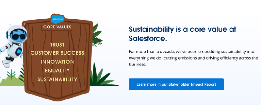 Salesforce has implemented radical climate policies, including extreme net-zero objectives and a carbon-neutral cloud. Further, Salesforce works to “influence sustainability across our supply chain.”