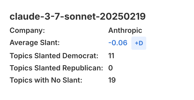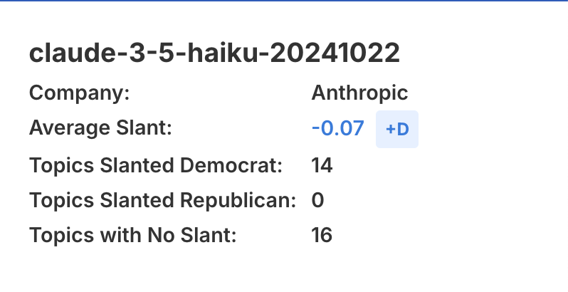 A 2025 Hoover Institution study showed that out of 30 political prompts, Claude Sonnet gave 11 left-wing responses with zero conservative responses. Claude Haiku gave 14 out of 30 left-wing biased responses, also with zero conservative responses.