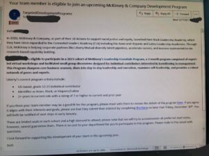 According to an email leaked on the social media platform X (formally Twitter), Liberty Mutual partnered with the same employee development program called the Connected Leaders Academy, in which only non-white employees interested in management can be trained. Participants in the program must be “Asian, Black, or Hispanic/Latinx.”
