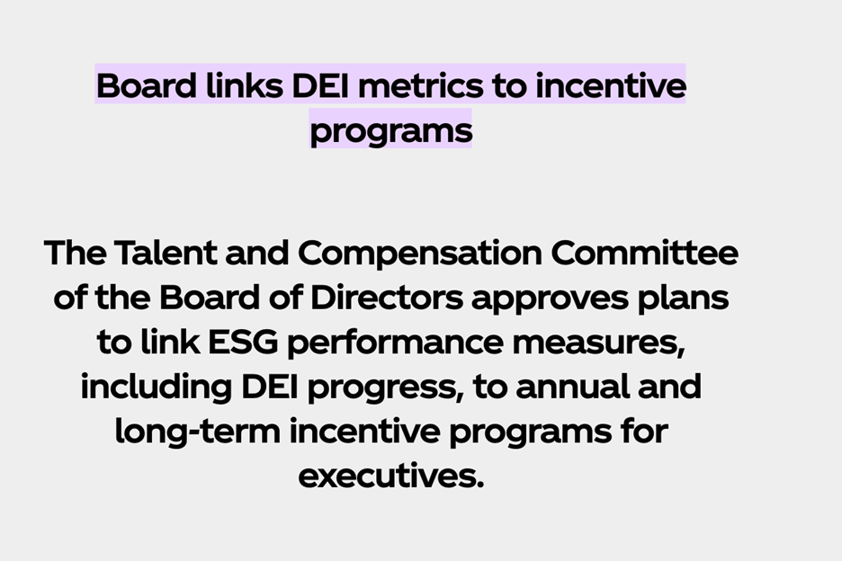 In 2022, the Talent and Compensation Committee of Coca-Cola’s Board of Directors linked ESG performance measures, including DEI progress, to annual and long-term incentive programs for executives.