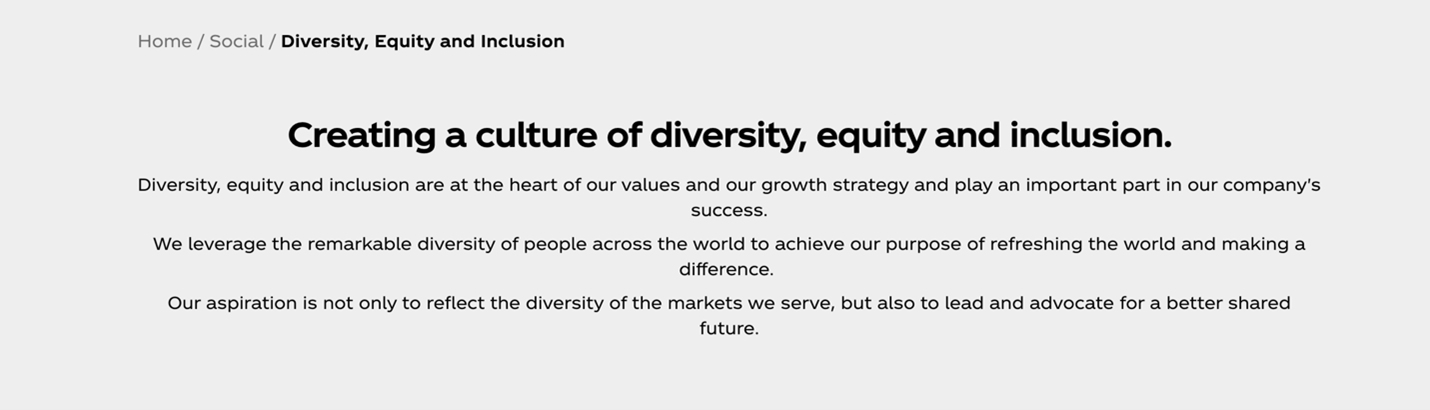 Coca-Cola is also all in on diversity, equity, and inclusion (DEI), stating “Diversity, equity and inclusion (DEI) are at the heart of our values and our growth strategy and play an important part in our company’s success.”