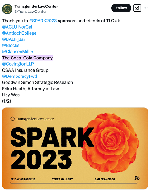 TLC also listed Coca-Cola as a sponsor for its annual Spark Conference, an event dedicated to “celebrating trans people thriving and fighting for liberation.”