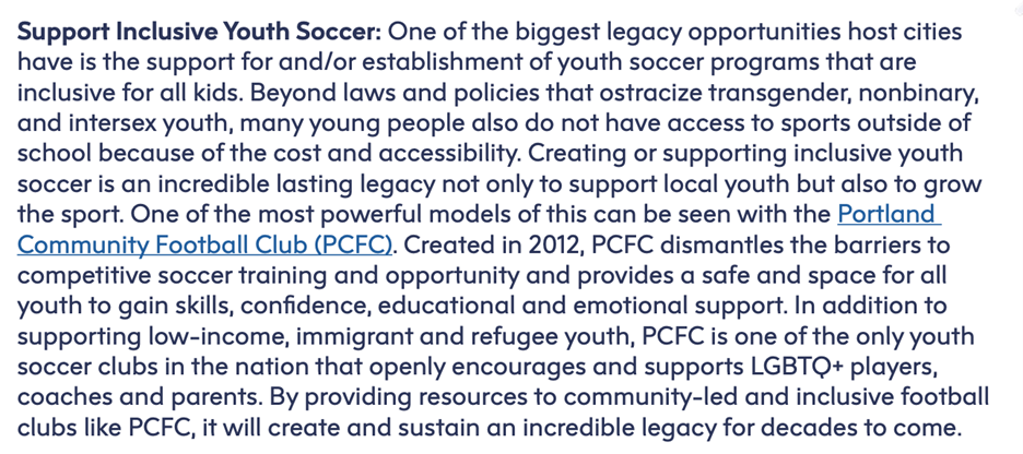 CSHR also published a guide for how U.S. host cities can create “opportunities for advancing transgender, nonbinary, and intersex inclusion” at the FIFA World Cup 2026. Some of its recommendations are to let boys play in girls’ soccer leagues, make bathrooms gender-neutral, and require gender-neutral language.