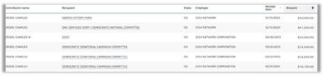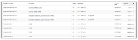 Charles and Cantey Ergen, the founders of DISH, are major donors to Democratic candidates and entities, including the Hillary Victory Fund, the Democratic National Committee, and the Harris Victory Fund. Charles Ergen is also the founder of DISH’s parent company, EchoStar, and serves as Chairman of the Board of Directors.