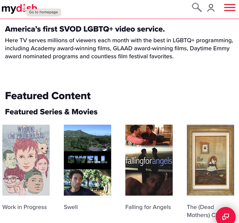 DISH Network offers the first streaming LGBTQ+ video service called Here TV. Here TV is a 24/7 LGBTQ+ streaming service formed to twist traditional TV programs to reflect LGBTQ+ values. MyDISH advertises a whole web page for Here TV.