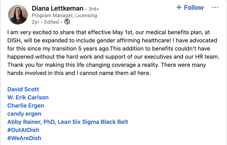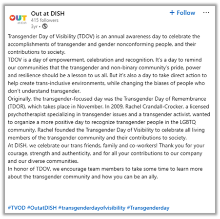 Out at DISH also urged employees to “take some time to learn more about the transgender community and how you can become an ally” to celebrate transgender day of visibility.