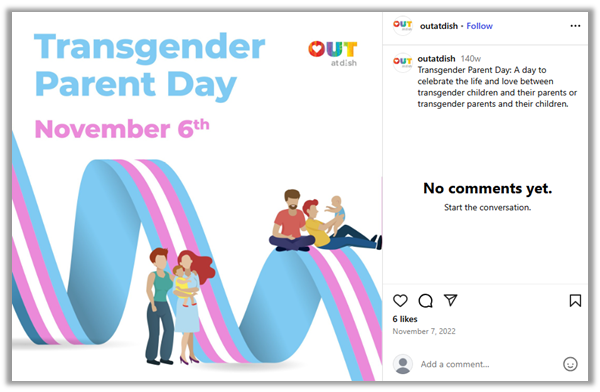 Out at DISH also flaunted its wokeness on “Transgender Parent Day” praising both transgender children and transgender parents.