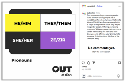 In 2022, Out at DISH warned its Instagram followers to “stop assuming someone’s gender,” saying “It’s time to let go of Sir/Ma’am” and encouraged them to offer and ask for pronouns immediately when meeting someone.