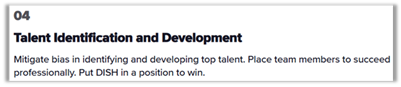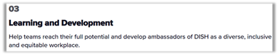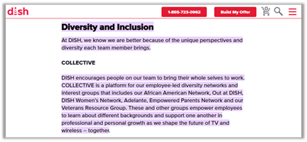 On its now-deleted diversity, equity, and inclusion page, DISH stated that it is “committed to embracing a diverse, equitable and inclusive workspace where all team members thrive.” DISH implemented “five strategic pillars of focus” to promote their DEI agenda: 1) Recruiting, 2) Data and Analytics, 3) Learning and Development, 4) Talent Identification and Development, and 5) Organizational Processes.