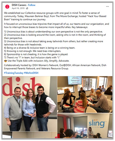 DISH has various employee resource groups, including Out at DISH, African American Network at DISH, and the DISH Women’s Impact Network. Though DISH deleted its DEI page, these employee resource groups are still listed as part of the Collective program on the DISH Cares page. Collective is a platform for DISH’s “employee-led diversity networks and interest groups.”