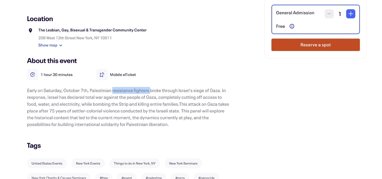 At the same time, Eventbrite did not take immediate action to remove pro-Hamas events in support of the violent attacks against Israeli civilians.
