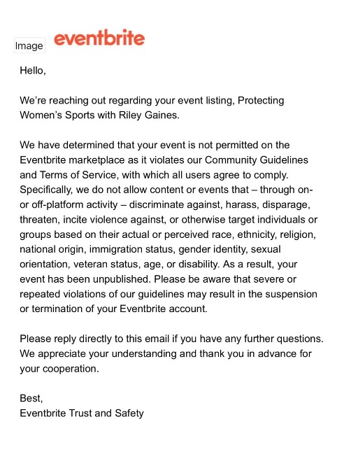 We encourage you to contact Eventbrite and tell them to stop censoring people who want to protect women’s sports programs. You can reach them via their website or X (formerly Twitter).