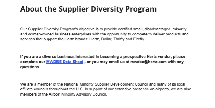 The company brags about supplier programs that discriminate against entire groups of business owners just for not fitting the DEI checklist. The Hertz website states: “Our Supplier Diversity Program’s objective is to provide certified small, disadvantaged, minority, and women-owned business enterprises with the opportunity to compete to deliver products and services that support the Hertz brands: Hertz, Dollar, Thrifty, and Firefly.”