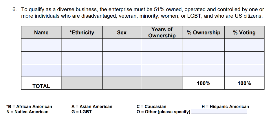 On the company’s “Disadvantaged Business Enterprise And Small Business Data Sheet,” it states: “To qualify as a diverse business, the enterprise must be 51% owned, operated and controlled by one or more individuals who are disadvantaged, veteran, minority, women, or LGBT, and who are US citizens.”