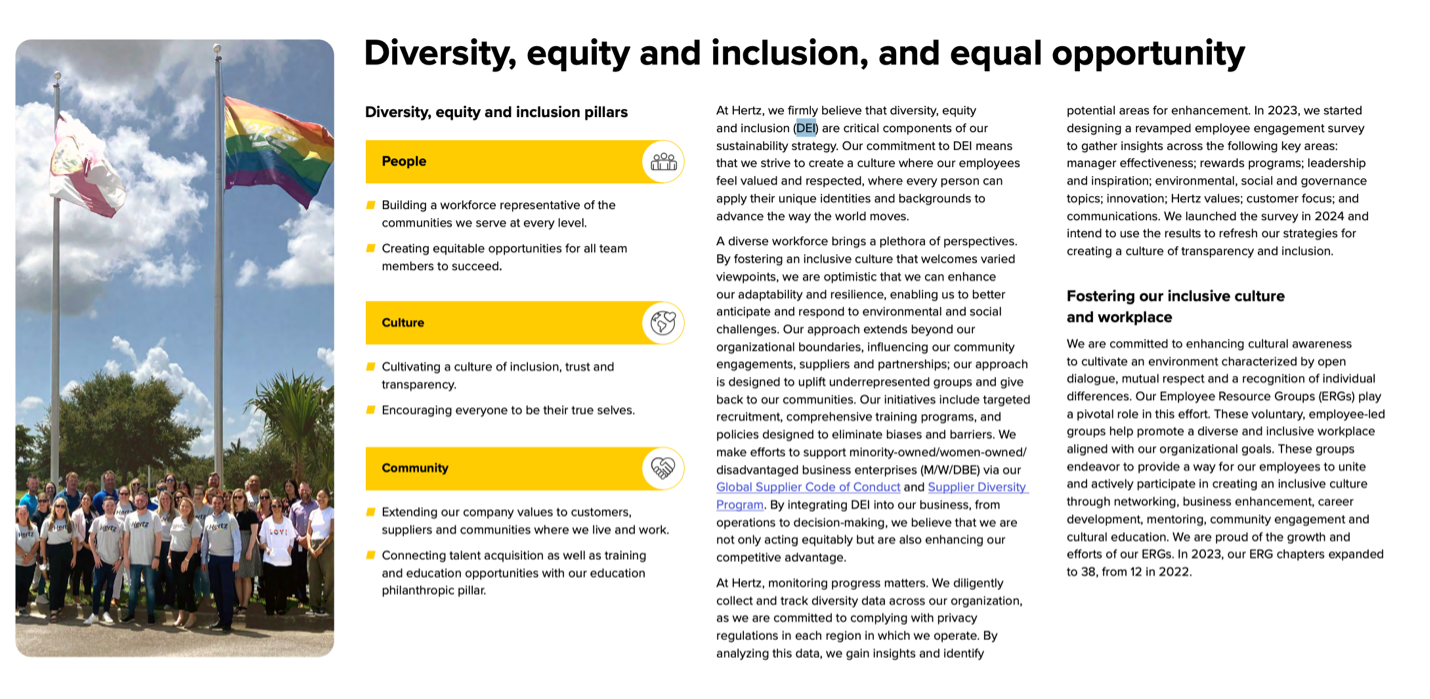 In the 2023 Hertz Sustainability Report, Hertz states they “firmly believe that diversity, equity, and inclusion (DEI) are critical components of our sustainability strategy.”