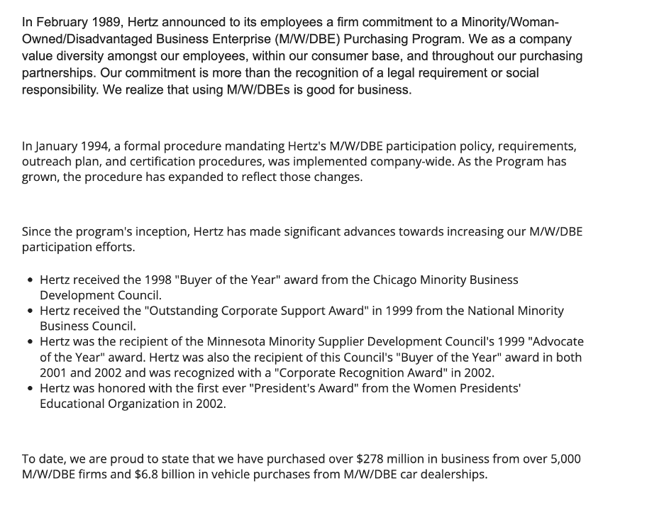 Additionally, Hertz has been an advocate for DEI policies. For decades, Hertz has prioritized race-based contracting and hiring quotas under the banner of “diversity.”