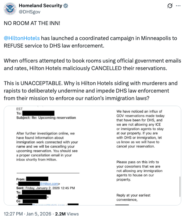 The U.S. Department of Homeland Security (DHS) says Hilton refused hotel rooms to Immigration and Customs Enforcement (ICE) agents in Minneapolis, canceling their reservations after learning they were federal immigration officers.