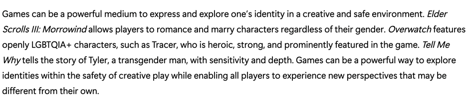 For example, the game Elder Scrolls III: Morrowind is rated appropriate for kids as young as 13 years old, but in the game, Microsoft touts that it “allows players to romance and marry characters regardless of their gender.”