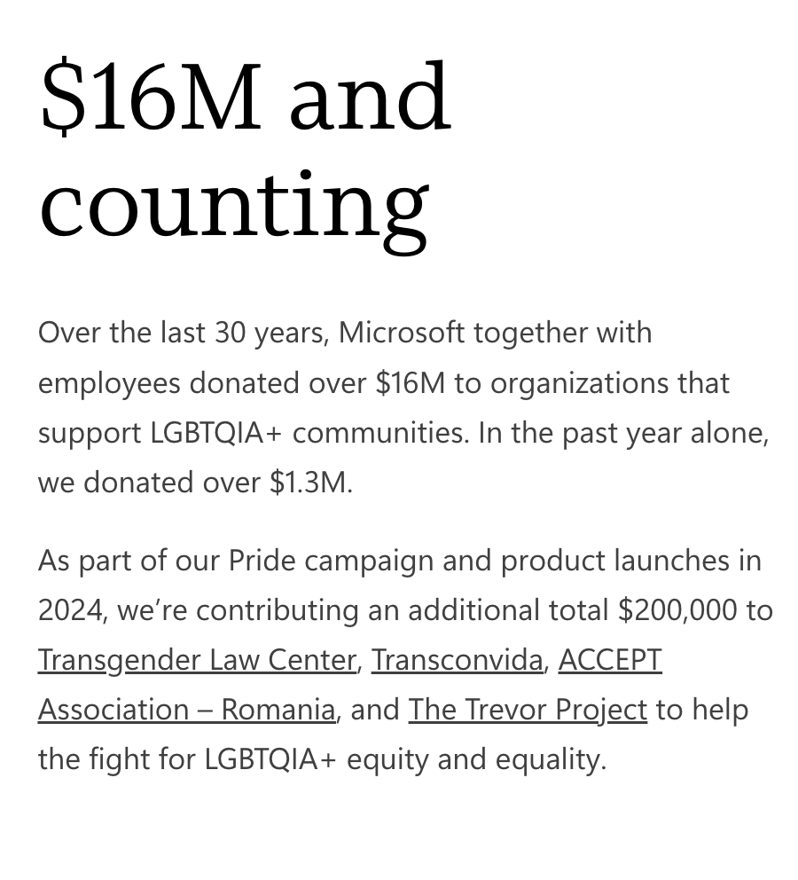 Microsoft also highlights its commitment to donating to groups promoting gender ideology on kids by pledging additional funding to “help fight for LGBTQIA+ equity and equality.”