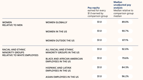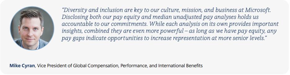 Microsoft also publishes its “pay equity” analyses where it compares wages among men and women and white and non-white employees with the goal of having the wages between the groups the same. The report states: “The fact that there are still deltas means we must stay focused on increasing representation at more senior levels.”