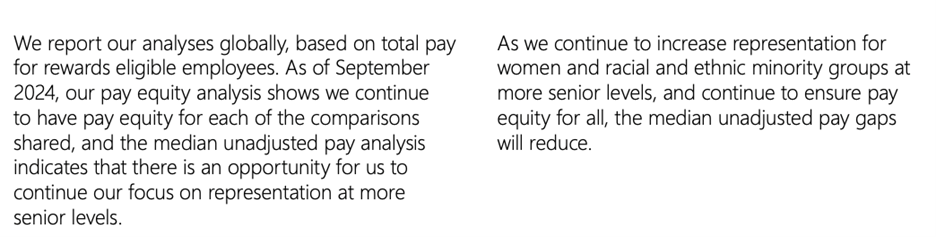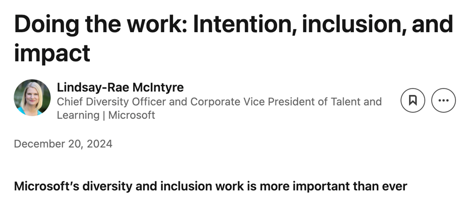 Lindsay-Rae McIntyre also stated in the 2024 Global Diversity & Inclusion Report that Microsoft’s DEI work is “ongoing” with an “urgency to accelerate our progress.”