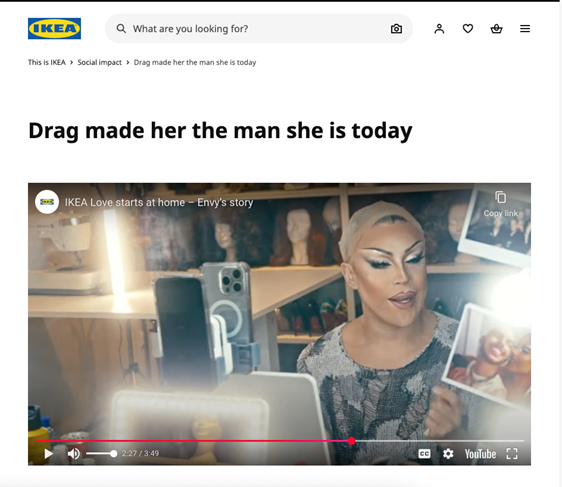 IKEA released a series of videos, one of which features drag queen Envy Peru. ”IKEA states, “Drag made her the man she is today,” and refers to him as “Envy (she/her/diva-in-drag).”