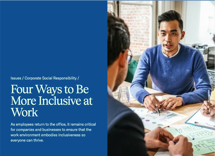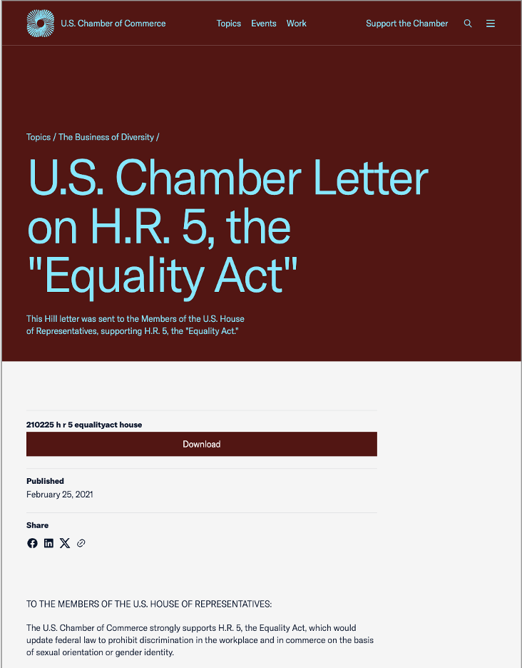 In a 2021 blog post, “Four Ways to Be More Inclusive at Work” the Chamber suggests making “Diversity, Equity, and Inclusion (DEI) a priority” stating: “The pandemic’s disparate impact on segments of the community, combined with highly visible examples of inequity based on race, ethnicity, sexual orientation, and gender identity at work, has forced employers to deliver on DEI objectives.”