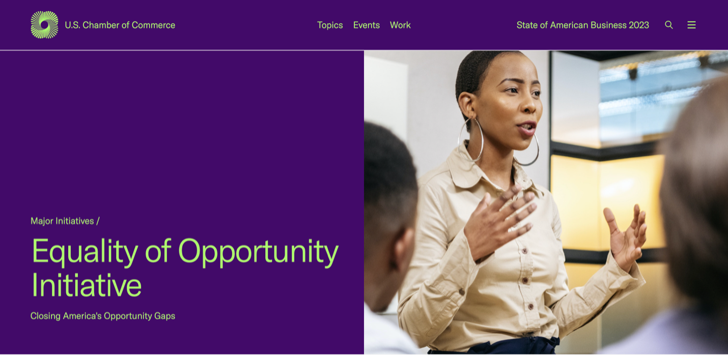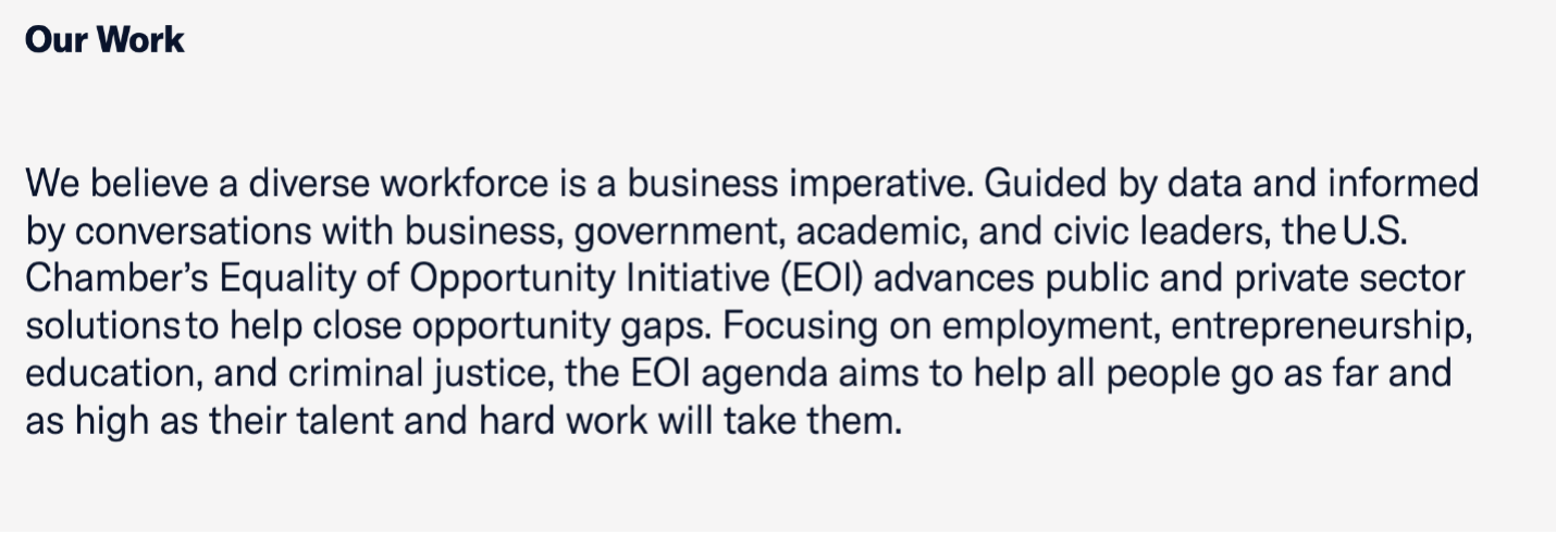 The Chamber promotes DEI through its “The Business of Diversity” webpage, where the organization states, “We believe a diverse workforce is a business imperative.” The organization also advocates for DEI with its “Equality of Opportunity Initiative” or EOI, which focuses on “employment, entrepreneurship, education, and criminal justice.”