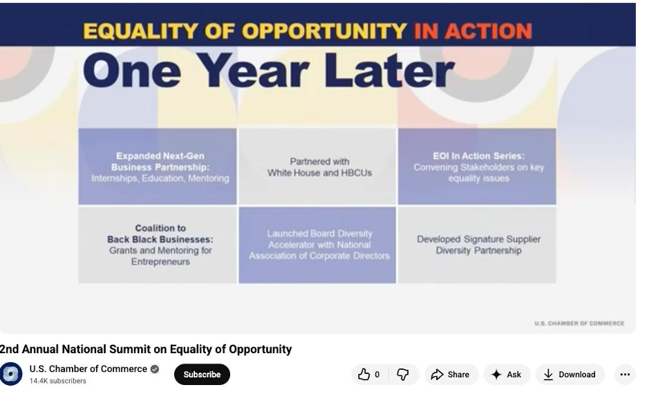 The Chamber also highlighted its commitment to DEI policies in a 2021 video where the organization explained that the EOI started because “George Floyd’s murder sparked a global movement to drive real change.” In the video’s description, it says that the EOI is there to address the “underlying challenges driving inequality of opportunity for Black Americans and other people of color in six critical areas: education, employment, entrepreneurship, criminal justice, health, and wealth.”